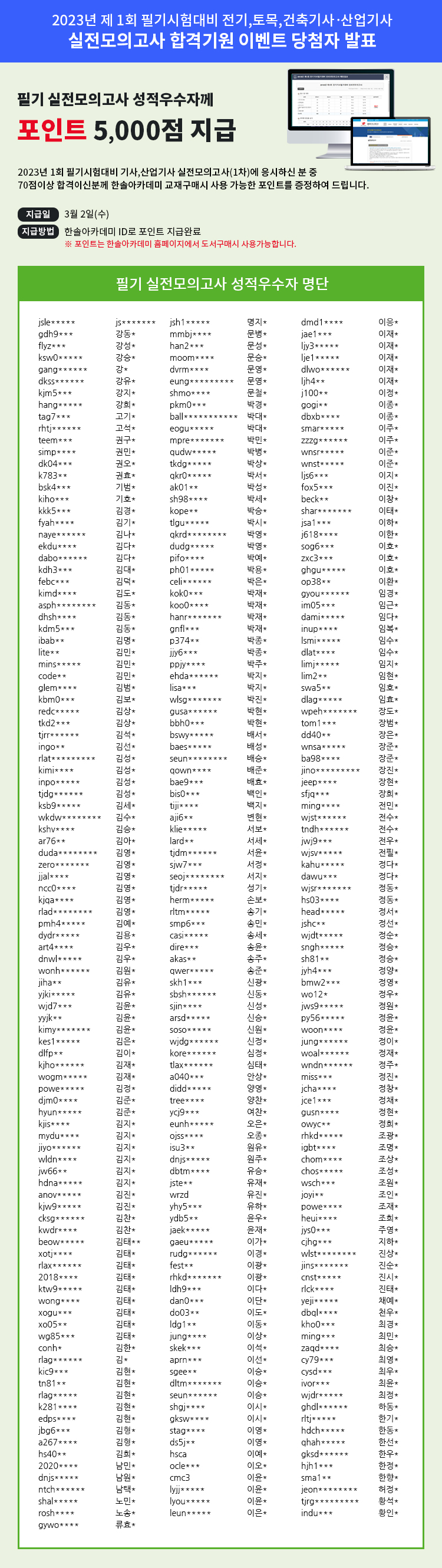 [전기/공사기사] 제 1회 기사, 산업기사 필기대비 실전모의고사(2차) 성적우수자 이벤트 당첨자 발표
