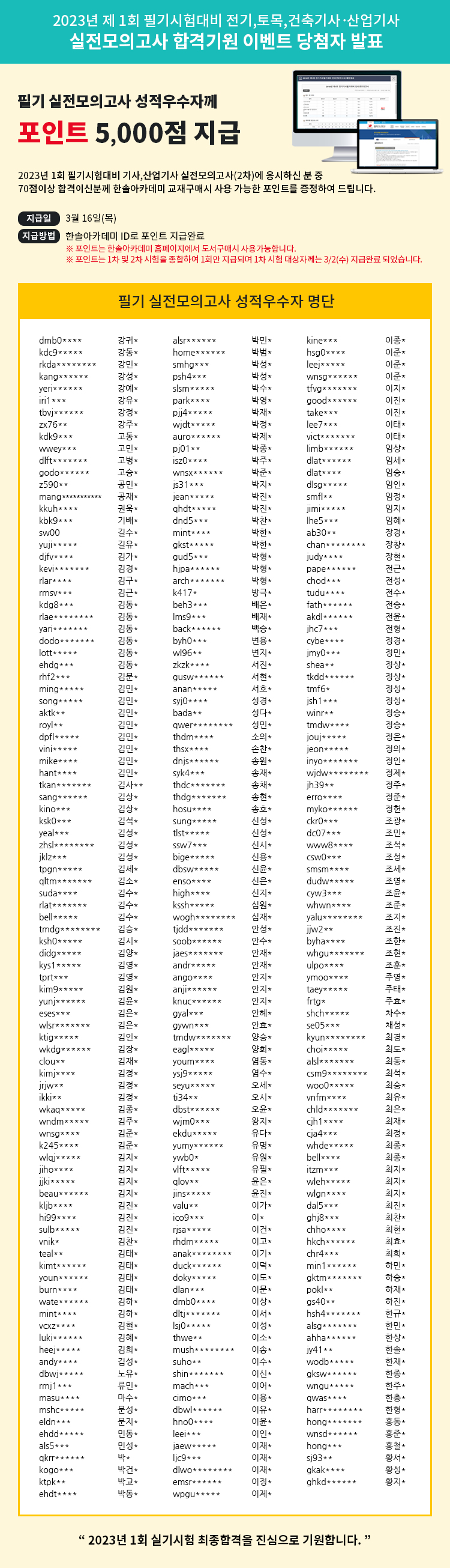 [전기/공사기사] 제 1회 기사, 산업기사 필기대비 실전모의고사(1차) 성적우수자 이벤트 당첨자 발표