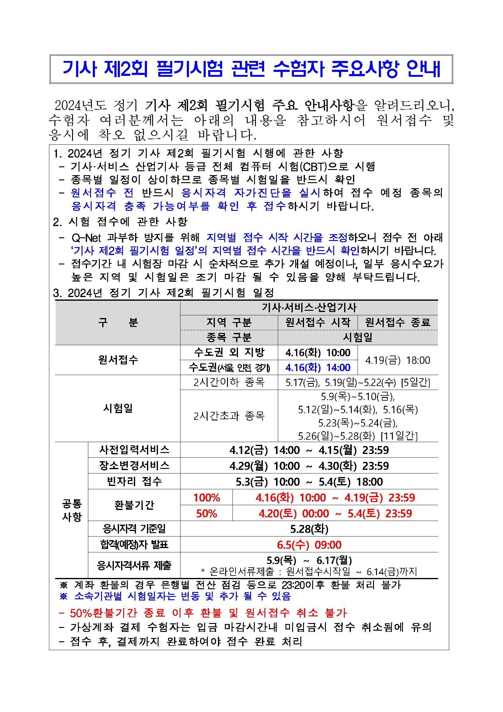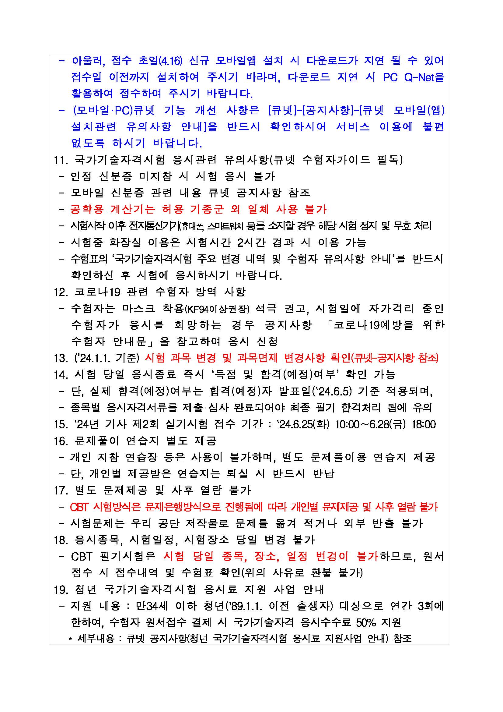 2024년도 기사 제2회 필기시험 원서접수 주요 안내사항