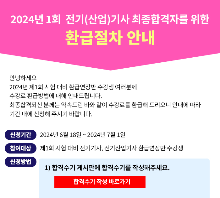 2024년 1회 시험대비 전기(산업)기사 환급+연장반 환급절차 안내