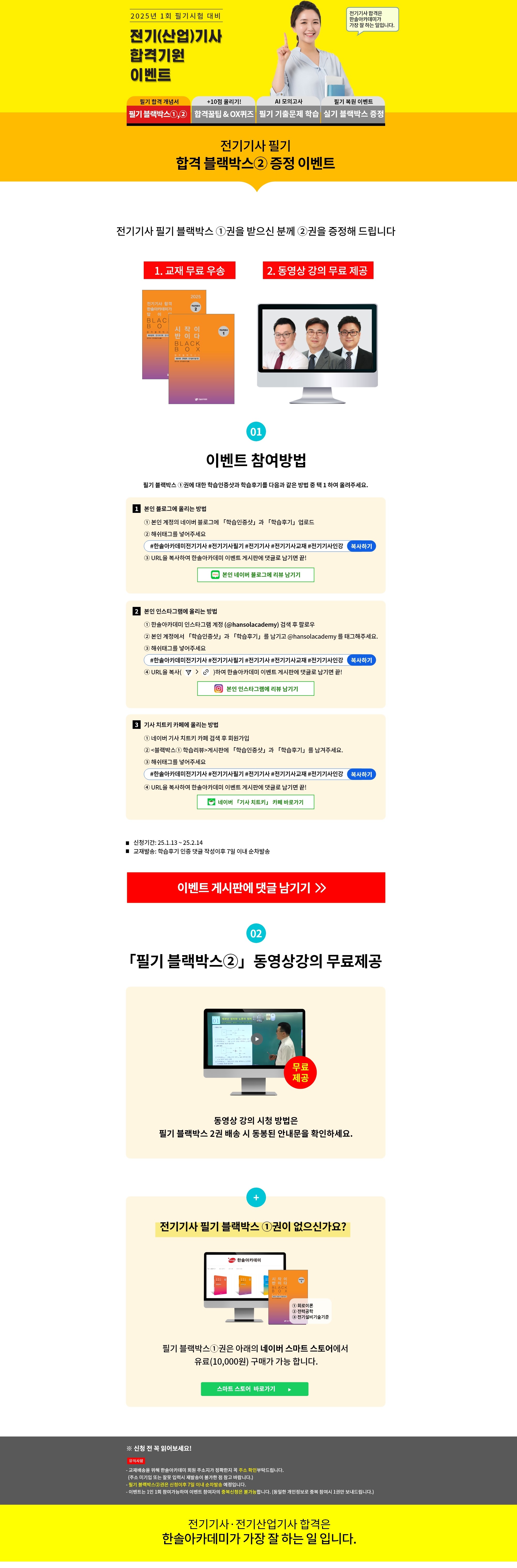 안녕하세요? 한솔아카데미입니다. 블랙박스②권 무료증정 이벤트를 실시합니다! 본인 인스타그램, 네이버블로그, 「기사치트키」 네이버카페에 블랙박스①권의 학습후기와 인증샷을 남겨주시면 블랙박스②권을 무료로 증정합니다. 많은 참여 부탁드립니다. |
