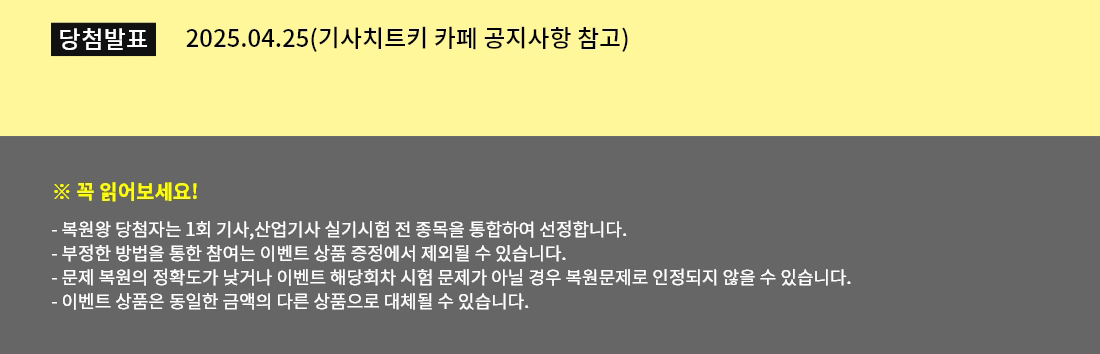 | 이전글 | [전기/공사기사] 2025년 제1회 오늘의 실기문제 출석체크 이벤트 당첨자 발표 |