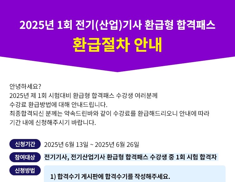 2025년 1회 시험대비 전기(산업)기사 환급형 합격패스 환급절차 안내