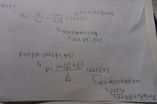 교재에 풀이방식과 정답을 계산기로 계산했을때 225v로 딱 떨어진 것이 아닌 224.97...V로 나와 있고, 온라인 강좌의 교수님의 풀이방식으로 계산을 하니 225v로 소수점없이 딱 떨어져서 계산이