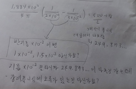 온라인 강의에서 지름 X 10-2을 했기 때문에 500이 아니라 249.873이 나온것 같은데