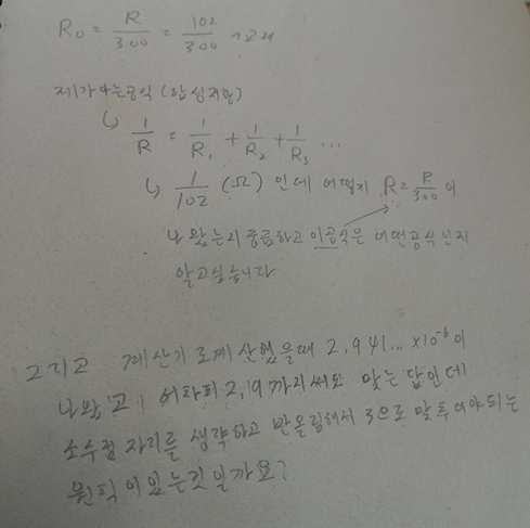 따라서 합성 저항 R0=R/n=102/300이 됩니다.