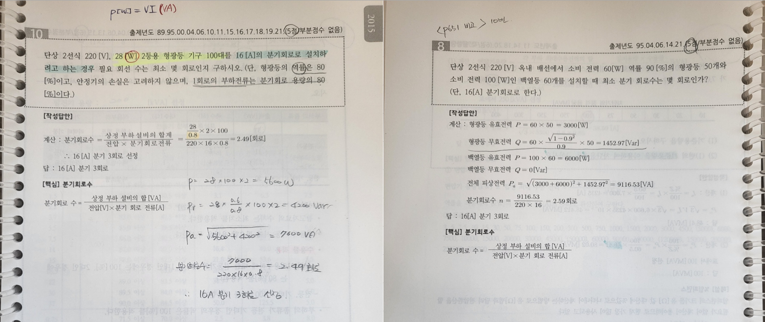두 문제 모두 분기회로수를 산정하는 문제인데, 한 문제(좌측)는 유효전력과 무효전력을 각각 구해 피상전력을 계산하는 벡터 합산 방식을 사용하고, 다른 문제(우측)는 총 유효전력을 역률로 나누어 피상전력을 구하는 단순 계산 방식을 사용합니다. 왜 풀이 과정이 다른지, 그리고 '상정 부하(VA)를 구하기 위해 역률로 나누어 준다'는 이해가 맞는지 궁금합니다.