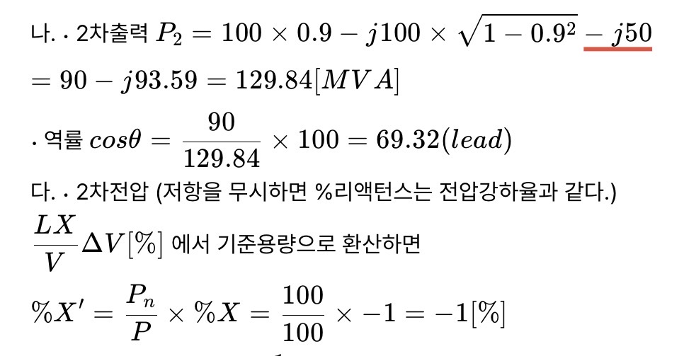 바뀌어야 함)하도록 P2=100*0.9-j100sin'θ+j50으로 정정하면 P2는 129.84[MVA]에서