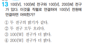 100V-100W와 100V-200W라는 말은 정격전압이 100V이고 정격전력이 100W, 200W이므로 이 둘을 직렬연결하여 100V를 연결하면 당연히 각각에 전압이 100V보다 작게 걸려 둘다 흐려지는 것은 당연한 것 아닌가요? 답이 3번으로 나와 있는 데 답이 3이 되기 위해서는 2번 보기를 다른 말로 바꾸어야 할 것 같습니다. 좋은 답변 기다리겠습니다