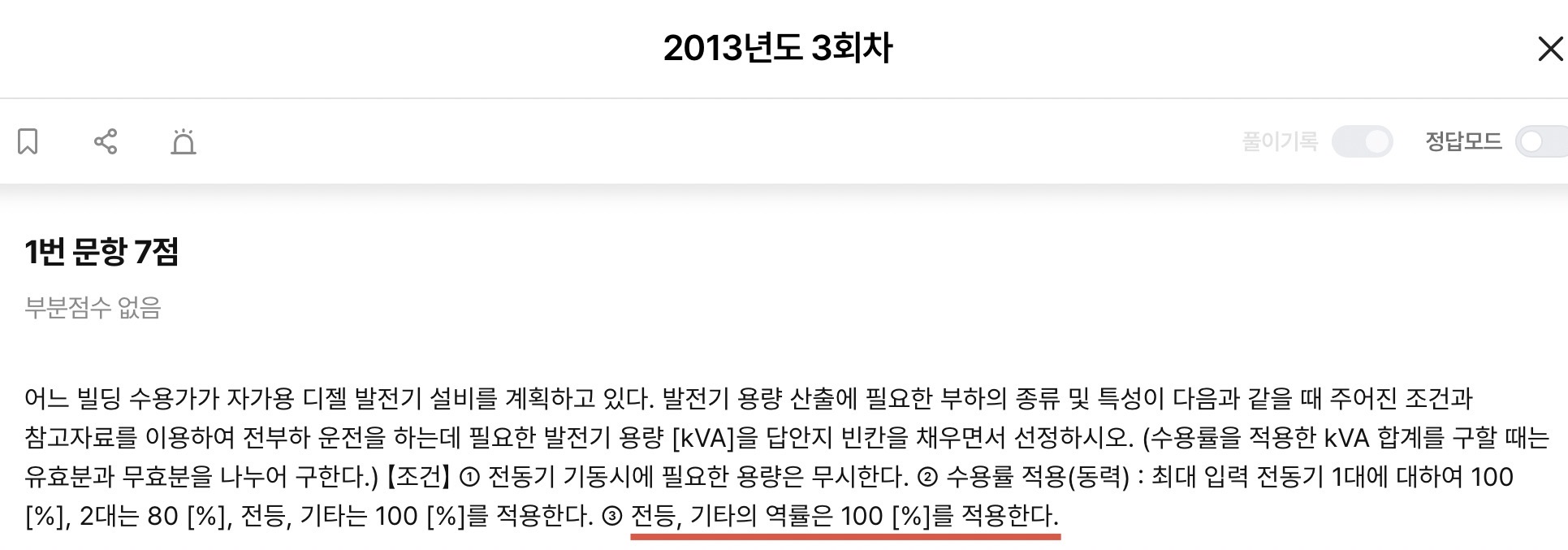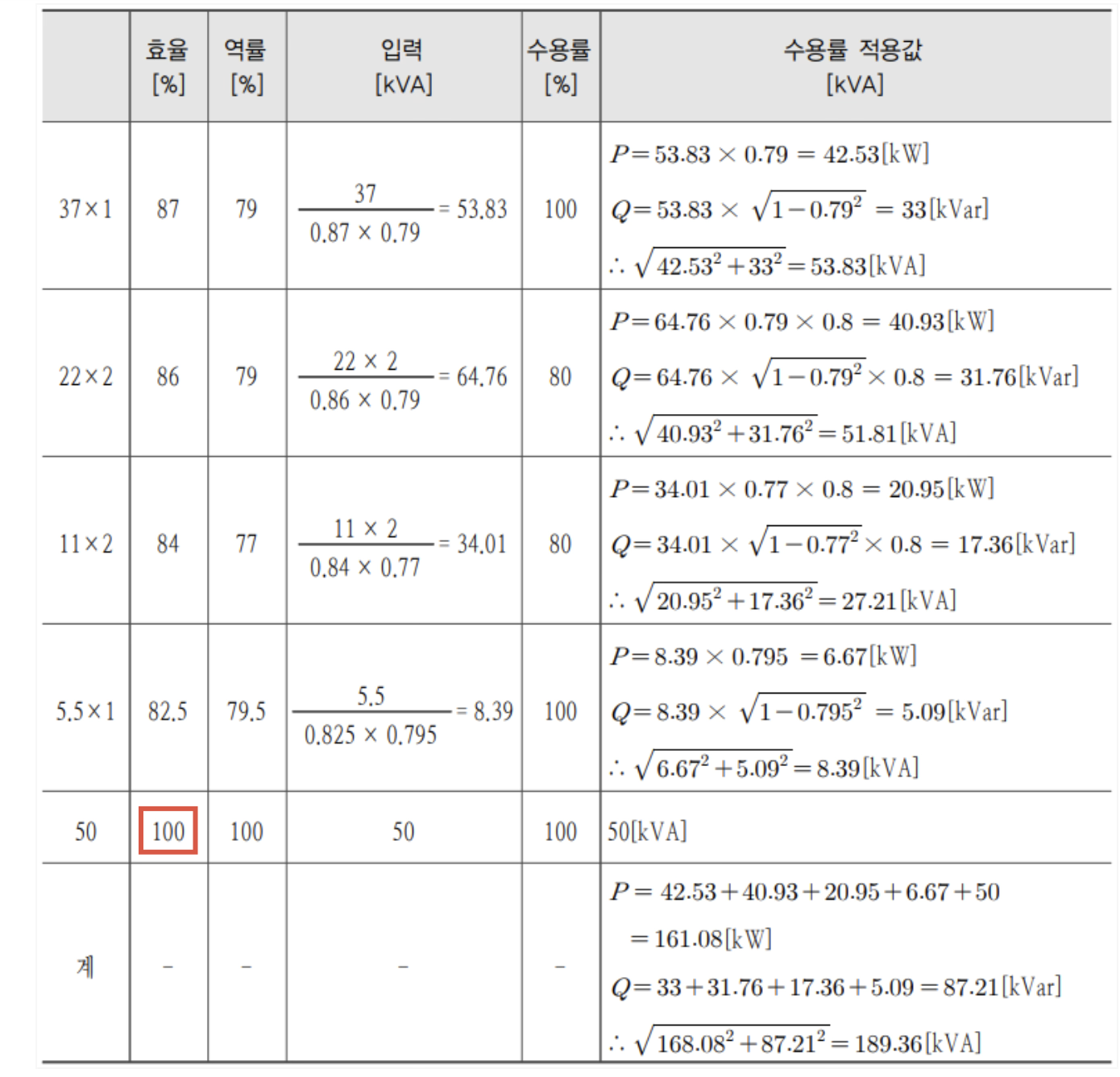 따라서, [전등, 기타] 부하 50 [kW]는 그 자체가 부하 설비가 소비하는 유효전력이므로, 별도의 효율 보정 없이 계산에 바로 적용하는 것이 올바른 풀이 방법입니다.