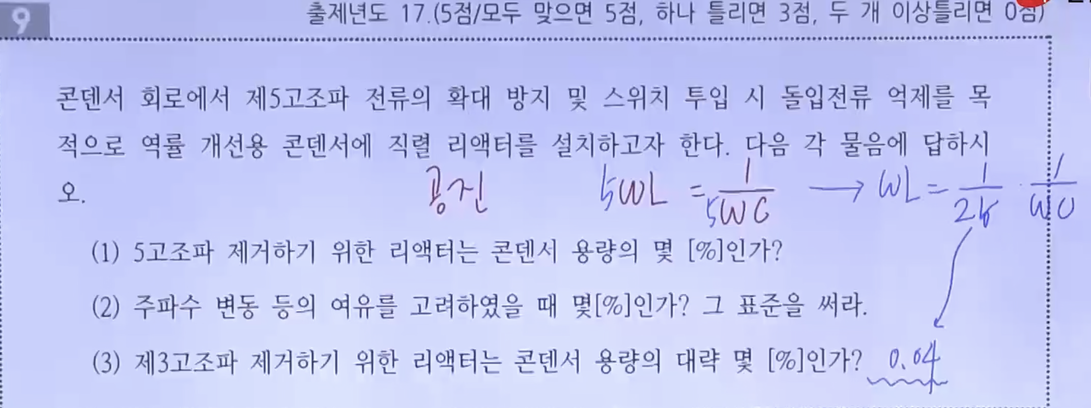 저는 문제에 "리액터는 콘덴서 용량의 몇 %인가?" ← 이 문구를 유도성 리액턴스가 아닌 인덕턴스 L값이 커패시턴스
