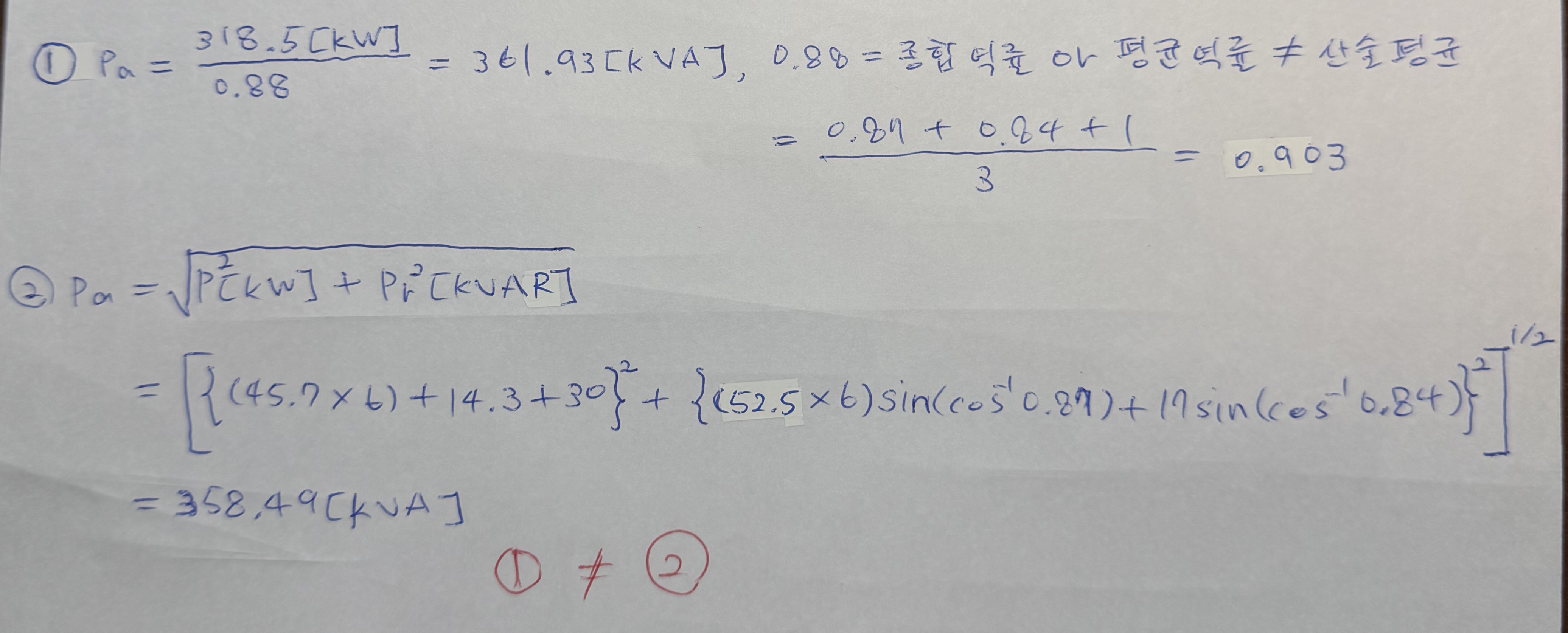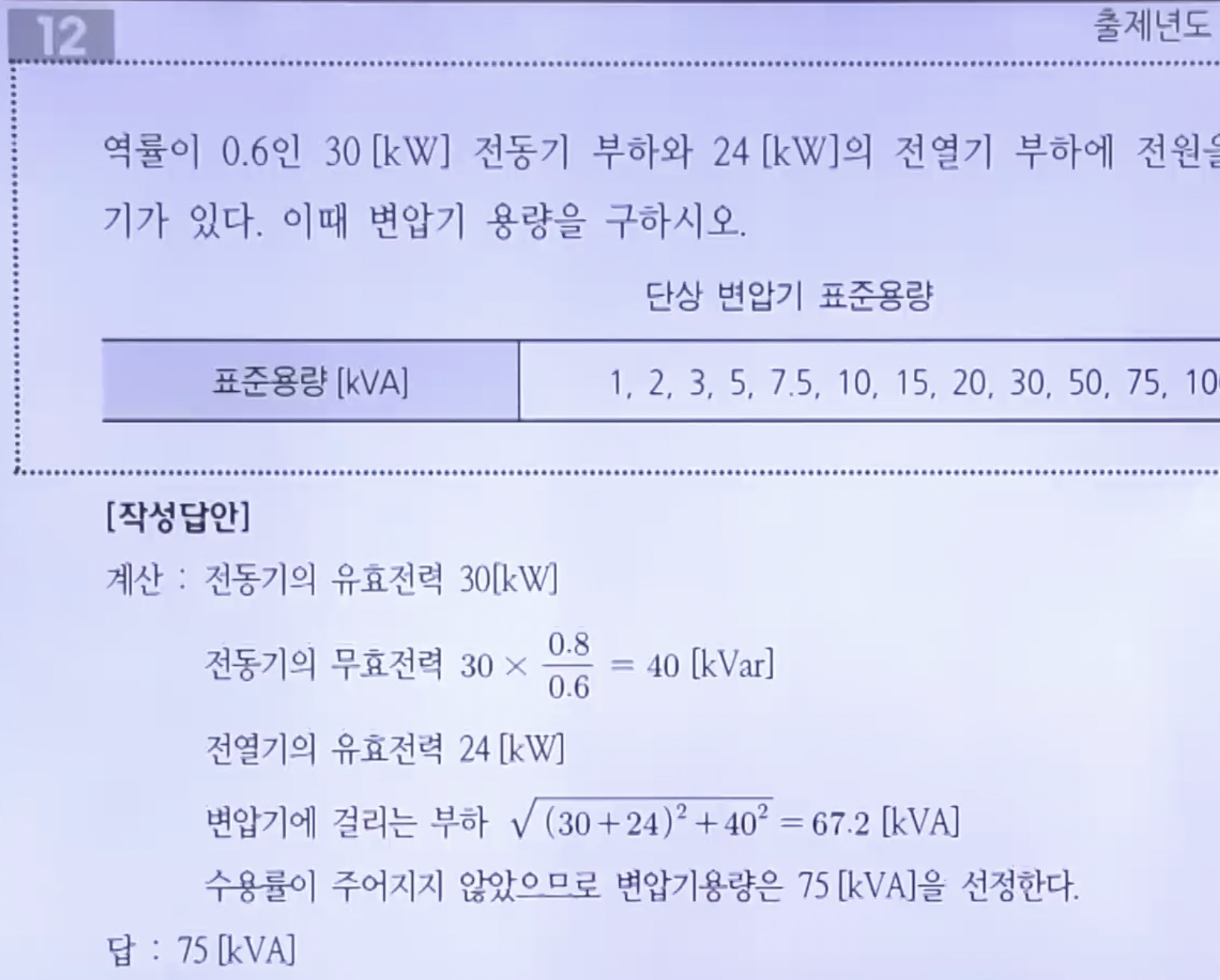 수험생께서 생각하신 30/0.6 + 24 = 74[kVA] 방식은 각 부하의 피상전력을 단순 합산한 것으로, 잘못된 접근입니다.