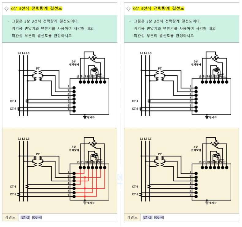 질문 요약: 3상 3선식 전력량계 결선 시, L1상에 설치된 CT1은 전력량계의 1S, 1L 단자에, L3상에 설치된 CT2는 3S, 3L 단자에 연결하는 것이 맞다고 배웠습니다. 하지만 첨부된 교재의 정답 그림에는 CT1이 3S, 3L에, CT2가 1S, 1L에 교차하여 연결되어 있습니다. 이 교재의 정답이 맞는 것인지, 아니면 오결선인지 궁금합니다.