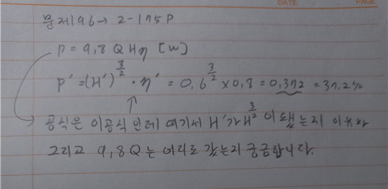 수력발전소의 출력은 유효 낙차의 3/2승에 비례합니다.