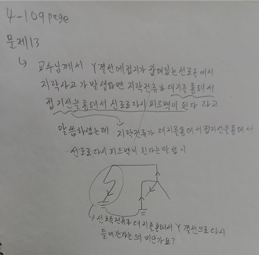 따라서 지락된 계통선에서 대지를 귀로하여 다시 Y결선의 중성점으로 통해 선로로 유입되는 회로가 구성됩니다..