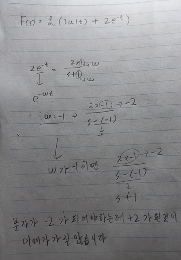 e^-t에서 t 앞의 숫자는 -1로 표현되어 있고, e^-wt에서 t 앞의 기호는 -w로 표현되어 있기 때문에 -w=-1 식을 풀면 w=1이 되네요..