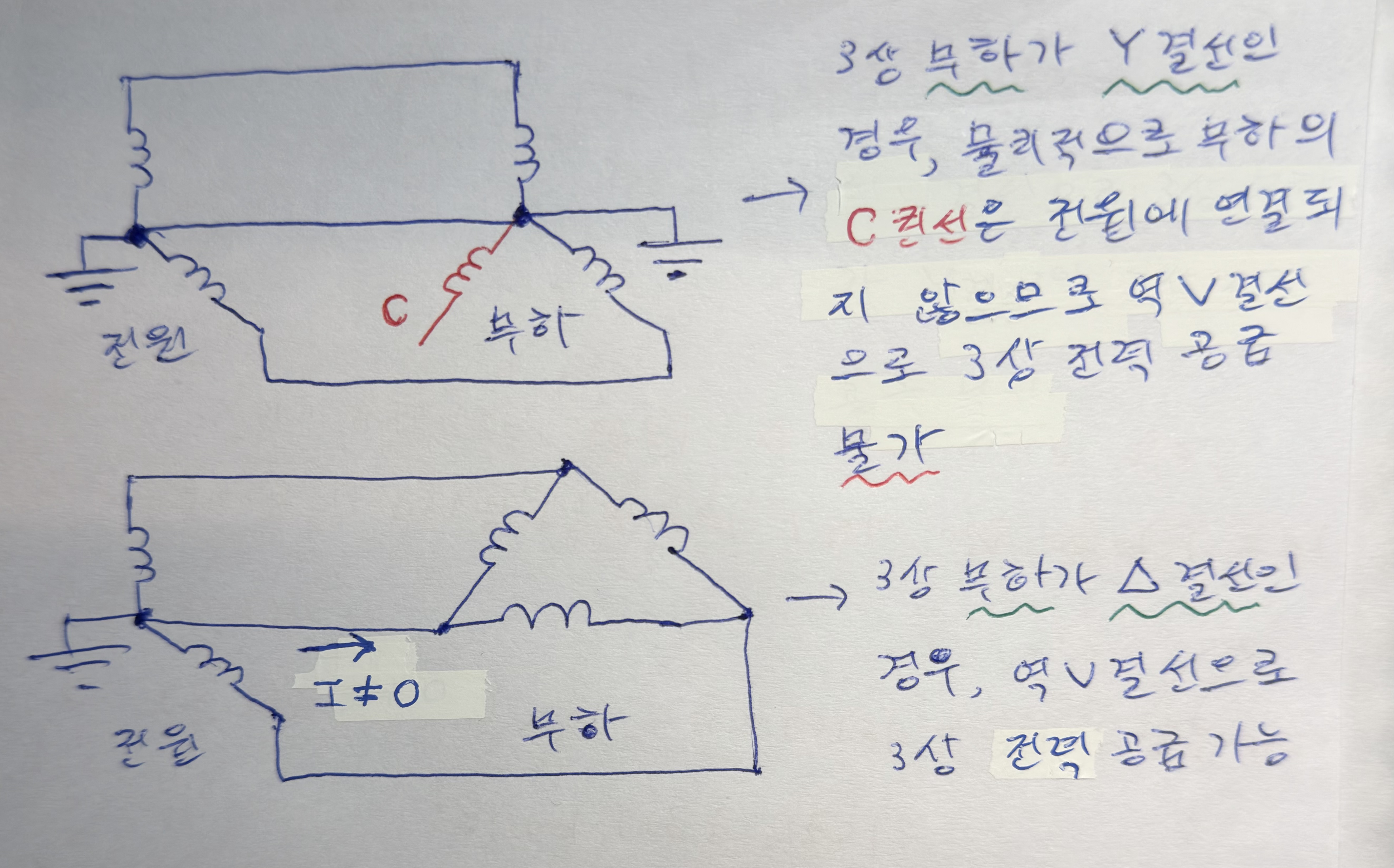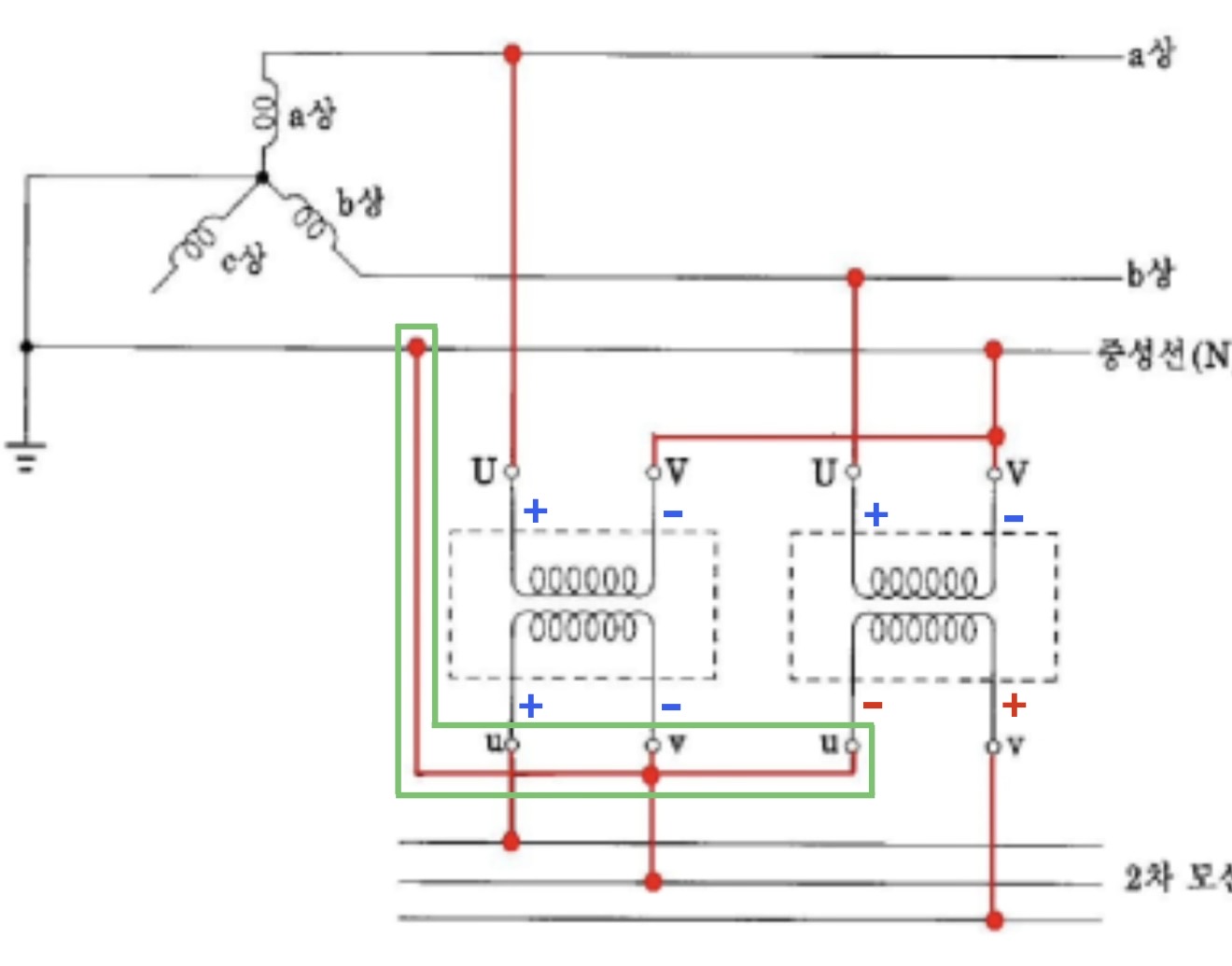 첫 번째 첨부 그림에 우측 중단 부분의 회로(세 개의 상전압이 부하에 공급되는 루프를 청색/적색/녹색으로 각각 표기)와 같이 [전원 - 부하] 전력 전송에 있어서 전원측 변압기가 3상4선식 와이 결선이고 부하측 변압기가 3상4선식 와이 결선일 때, 역V 결선으로 3상 전력 공급이 가능하다고 생각했는데
